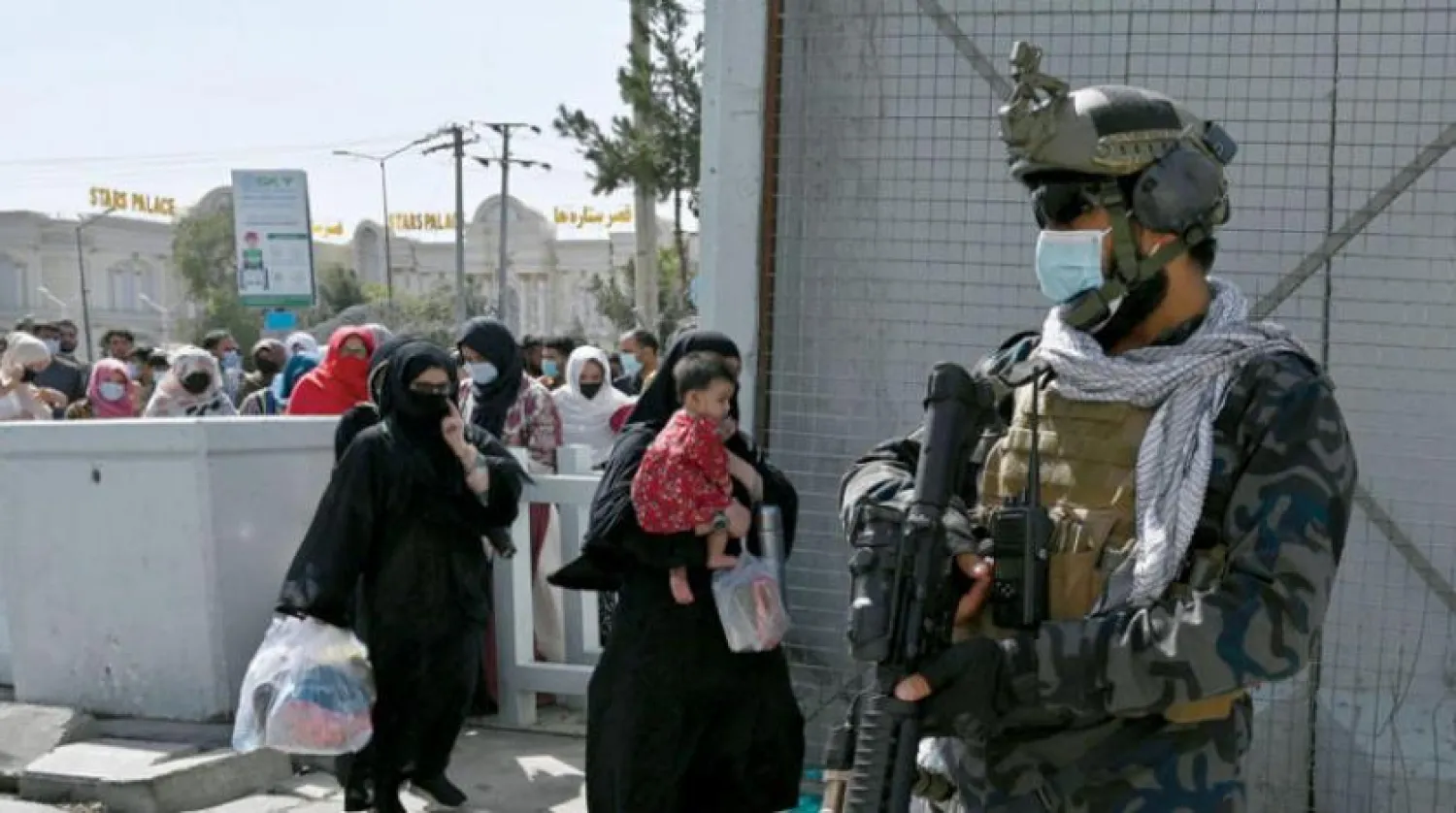 "طالبان" تحریک میں "بدر فورس" کے ایک رکن کو کل کابل ایئر پورٹ کے داخلی دروازے پر مرکزی دروازے کی حفاظت کرتے ہوئے دیکھا جا سکتا ہے (اے ایف پی)