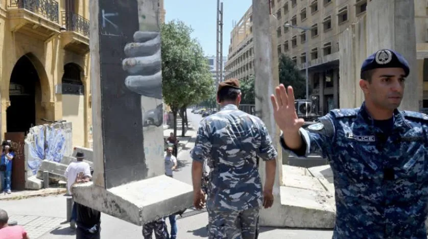 دو سیکورٹی اہلکار لبنانی پارلیمنٹ کے ہیڈ کوارٹر کی سڑکوں پر سیمنٹ کی رکاوٹ ہٹاتے ہوئے دیکھے جا سکتے ہیں (ای پی اے)